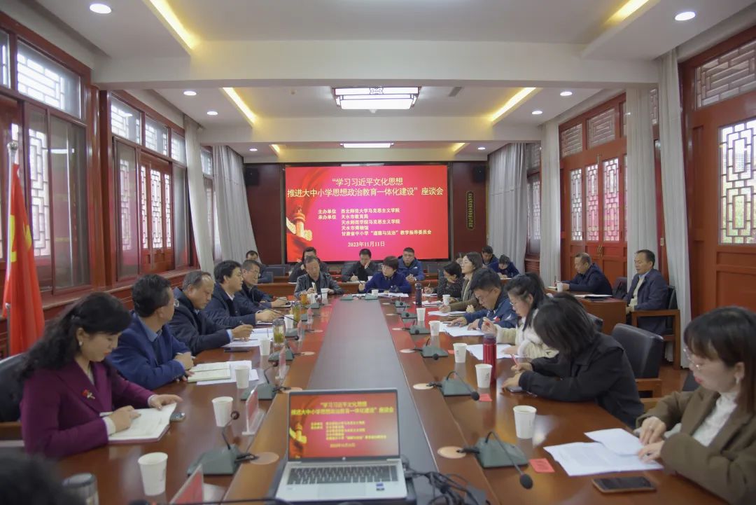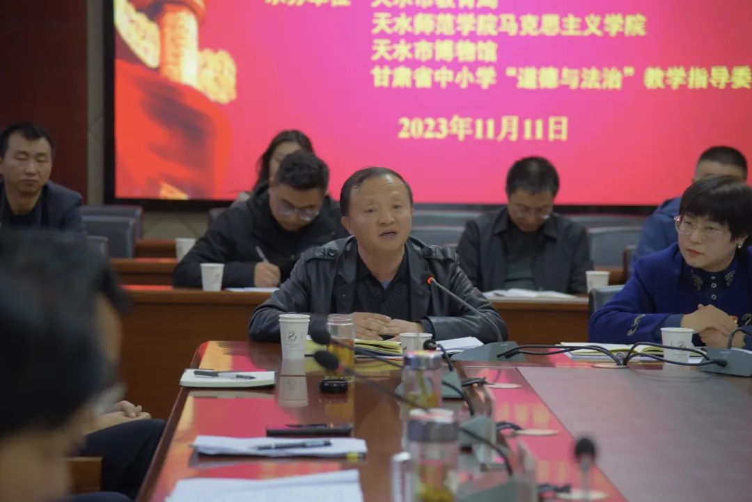 11月11日下午,由西北师范大学beat365官方网站、天水市教育局、天水师范学院beat365官方网站、天水市博物馆、甘肃省中小学“道德与法治”教学指导委员会共同举办的“学习习近平文化思想 推进大中小学思想政治教育一体化建设”座谈会在天水市博物馆畅和轩会议室隆重召开。西北师范大学beat365官方网站党委书记刘德雄、院长史小宁、党委副书记王宏渊,天水师范学院beat365官方网站党委书记刘建军,天水市教育局党组成员、总督学张永蔚,天水市博物馆党总支副书记、副馆长崔文刚等领导参加会议。