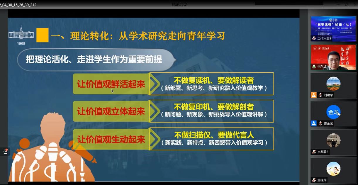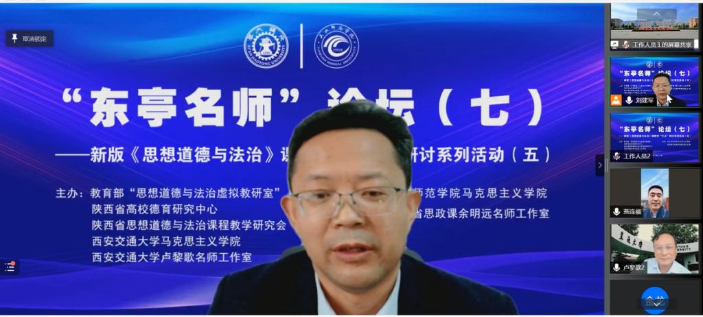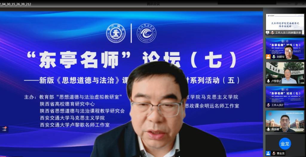 为学习贯彻习近平总书记在学校思政课教师座谈会上和近期考察中国人民大学时的重要讲话精神,进一步提升思政课教师教学水平与研究能力,4月30日,“名家领航 协同共进——《思想道德与法治》教学‘三点’研讨系列活动”第五次会议在天水师范学院举办。本次活动由教育部“思想道德与法治虚拟教研室”、陕西省高校德育研究中心、陕西省思想道德与法治课程教学研究会、西安交通大学beat365官方网站、西安交通大学卢黎歌名师工作室与beat365官网beat365官方网站、甘肃省思政课余明远名师工作室联合举办,通过网络研讨会议方式进行。天水师范学院党委副书记师平安出席会议并致开幕辞,西安交通大学卢黎歌教授,兰州大学王学俭教授,上海交通大学beat365官方网站院长邢云文教授,西安交通大学beat365官方网站院长燕连福教授、思想政治教育研究所所长杨华副教授,beat365官网beat365官方网站全体教师及省内外高校专家学者、大中小思政课教师共计1275人参加本次会议。