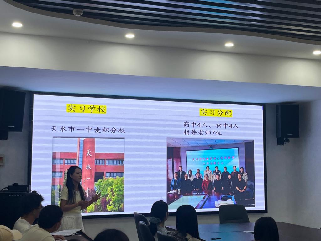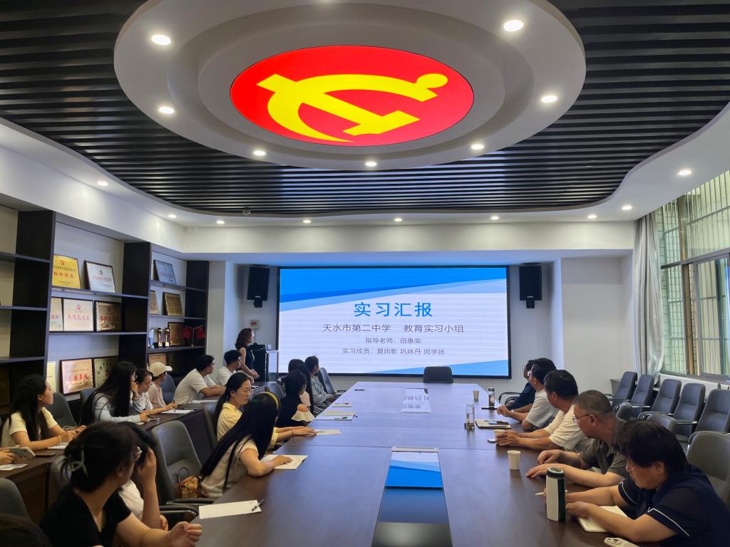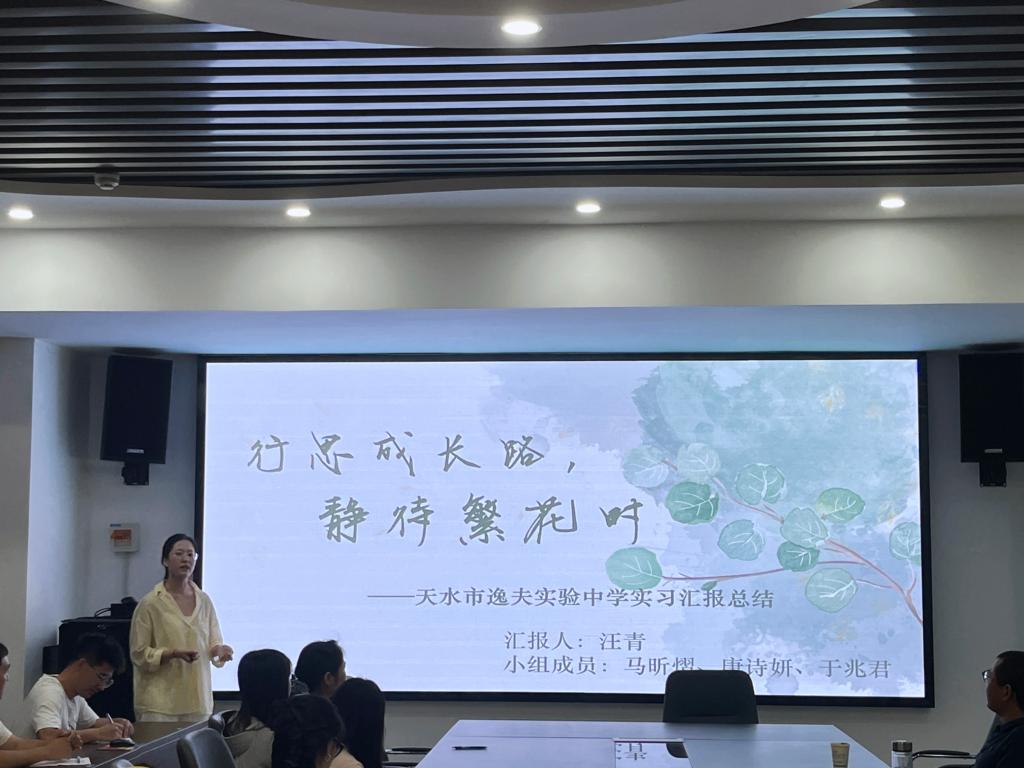 汇报环节中,各实践小组代表轮流汇报分享了教育教学实践成果与体会感悟。高海东代表陇西文峰中学实践组,从教学工作、教研活动及实习感悟三方面进行总结;霍霨代表天水市一中(本部)实践组,围绕教学实践、班级管理和教研活动展开汇报;孙蓉芳代表天水市第一中学(麦积校区)实践组,介绍了实习基本情况、教学工作、班主任工作及收获;夏田影代表天水市第二中学实践组,以“明思以致远、实践获真知、立志而奋发”为主题分享实践体会;汪青代表天水市逸夫实验中学实践组,从“学榜样强师能、勇实践砺师技、暖师生筑情谊、重反思促成长”四个维度汇报实习历程。