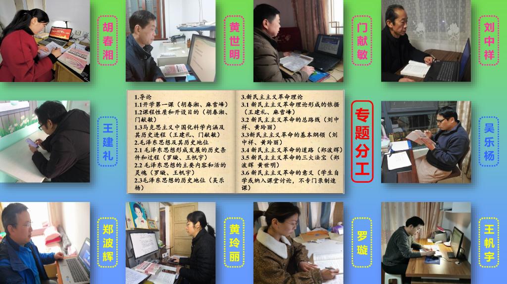 “概论”课是高校为本科生开设的思政课中学分最多、课时最多的一门课程,为了追求更好的教学效果,“概论”教研室长期坚持“分工协作、集体研磨”的备课模式。在当前战“疫”形势下,为更好实现“离校不离教、停课不停学”,“ 概论”教研室依据教师专业研究的特长,实行“专题分工备课、交互协同磨课、统一进度授课”,扎实做好集体备课的“云端课堂”第一环。