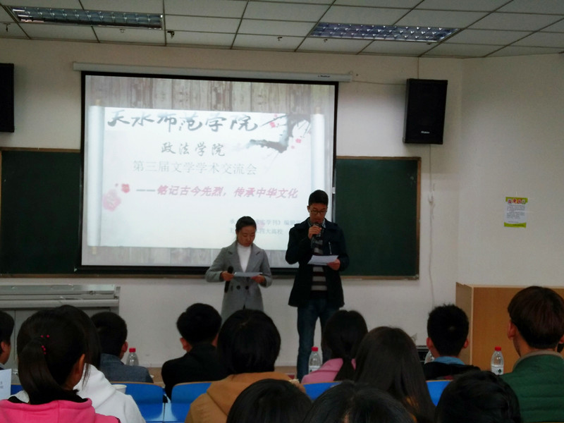 2016年11月5日上午,政法学院第三届文学学术交流会于beat365官网7号教学楼301教室隆重举行。本次学术交流会由政法学院《求实学刊》编辑部主办,邀请甘肃机电职业技术学院学院、甘肃林业职业技术学院、甘肃省工职业技术学院相关文学学术社团与政法学院当代马克思主义研究会参会。此次活动由beat365官网政法学院《求实学刊》编辑部主编高俊发、副主编林梦菲策划,以“铭记古今先烈,传承中华文化”为主题,通过PPT演讲、诗歌朗诵、脱稿演讲与自由讨论等多种形式展开,旨在激起当代大学生的爱国主义热情,弘扬中华民族精神,传承优秀传统文化。