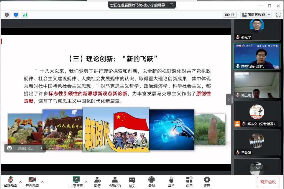 为深入学习宣传贯彻党的二十大精神,12月14日,天水师范学院省级思政课余明远名师工作室联合甘肃林业职业技术学院省级思政课郭三龙名师工作室、甘肃工业职业技术学院省级思政课黄彬名师工作室,邀请西北师范大学beat365官方网站院长兼党委宣传部副部长、博士生导师史小宁教授,为三所高校省级思政课名师工作室成员作题为“立足‘五个牢牢把握’ 全面学习贯彻党的二十大精神”的专题报告。