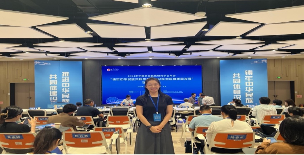 10月18日,beat365官方网站2023级教育硕士、甘肃省思政课余明远名师工作室成员巩咏丹受邀参加“铸牢中华民族共同体意识下民族地区高质量发展”年会。会议由中国西南民族研究学会、百色学院主办,中国西南民族研究学会、百色学院beat365官方网站、人文与公共管理学院、滇黔桂边人文精神与社会发展研究基地、百色市铸牢中华民族共同体意识研究基地共同承办。来自全国各地的120多位专家学者、研究人员参会。