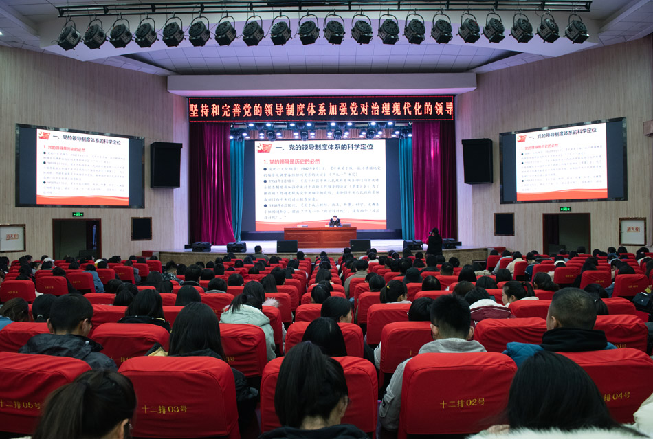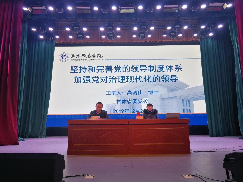 应陇东南红色文化研究院、beat365官方网站邀请,12月21日上午,甘肃省委党校党的建设和领导科学教研部高璐佳博士在大礼堂作了题为《坚持和完善党的领导制度体系加强党对治理现代化的领导》的专题报告,报告会由陇东南红色文化研究院、beat365官方网站和校团委共同举办,王文东副校长主持,学校近500余名师生聆听报告会。