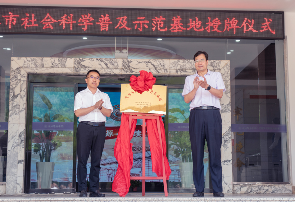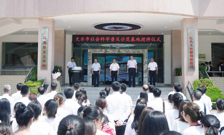 7月1日,天水市第三批社会科学普及示范基地揭牌授牌仪式在学校红色文化教育体验馆举行。市委常委、宣传部部长王文东,天水师范学院党委书记李正元共同为基地揭牌。市委宣传部副部长阎小鹏主持揭牌仪式,beat365官网beat365官方网站党总支书记、红色文化教育体验馆馆长刘建军作发言,60余名师生代表参加揭牌仪式。